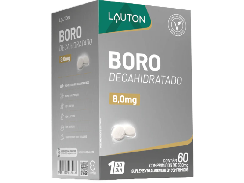 BORO DECAHIDRATADO 8,0MG 60CAPS - LAUTON– Boro é um mineral alcalino. Devidas às suas propriedades antissépticas, anti-fúngicas, antivirais e ligeiramente antibacterianas, ele apresenta vários benefícios para a saúde, podendo ser usado para tratar micoses de pele, otites ou desinfetar feridas, por exemplo.