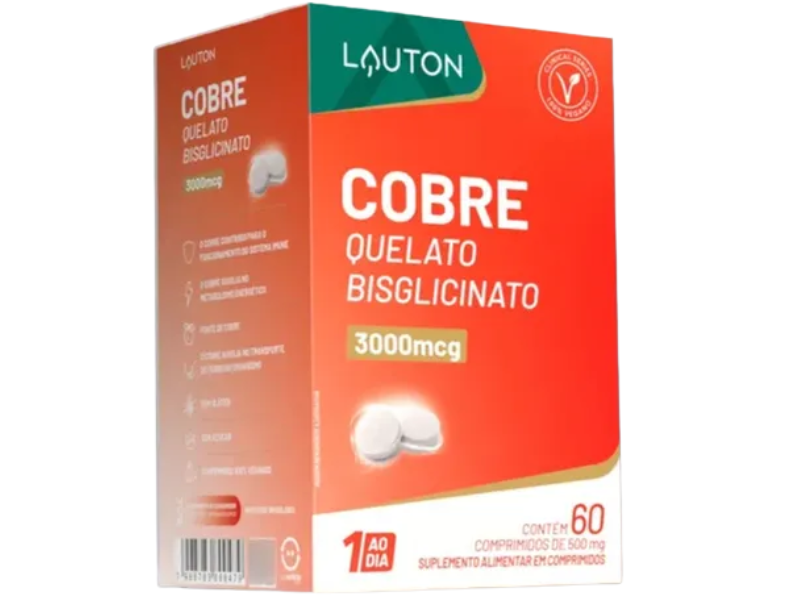 COBRE QUELADO BISGLICINATO 3.000MCG 60CAPS - LAUTON – O cobre ajuda na formação de algumas células sanguíneas, hormônios e enzimas antioxidantes, também contribui para a síntese de neurotransmissores, formação da bainha de mielina e regulação da expressão gênica. O cobre ainda ajuda a regular a quantidade de ferro no organismo e na formação de tecidos conjuntivos.